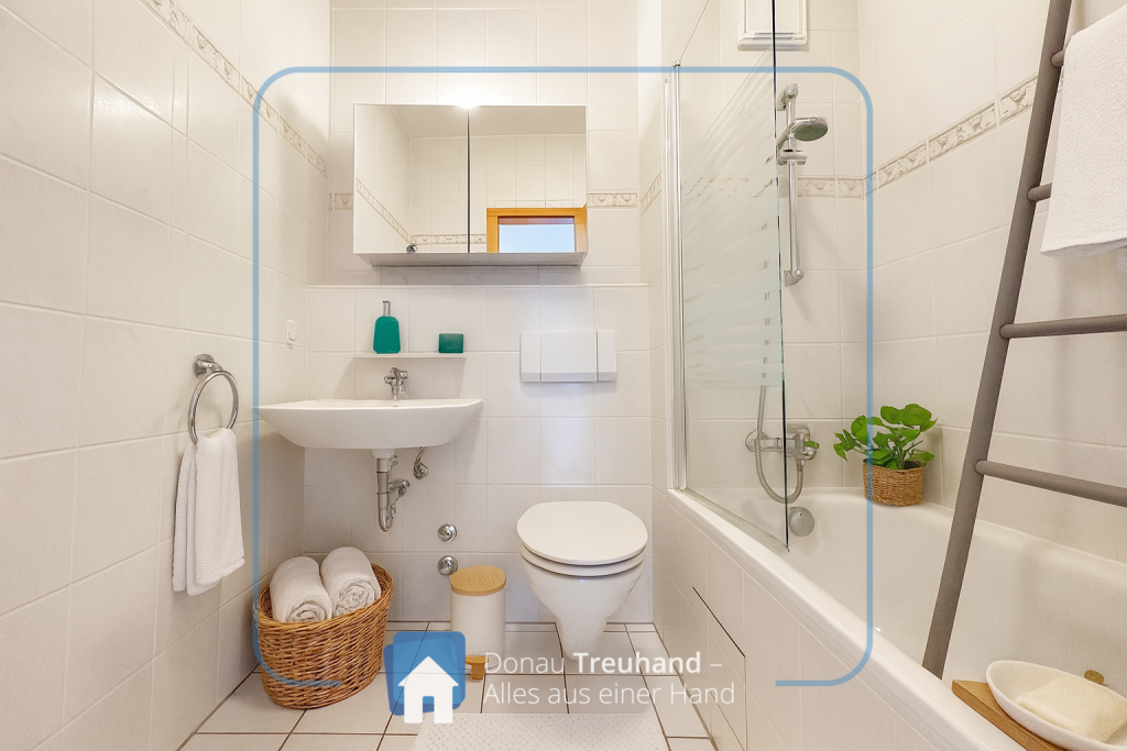 - Badezimmer mit weißen Fliesen, Badewanne + Glasduschwand