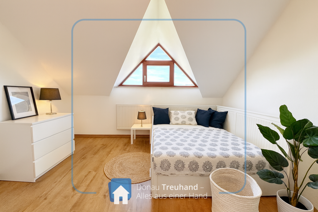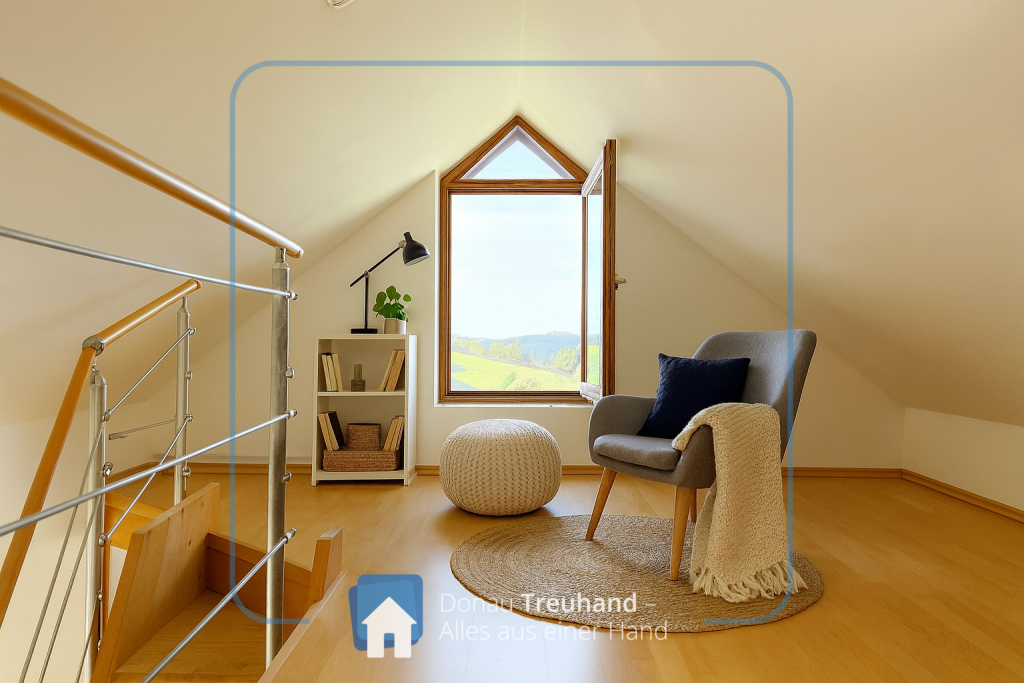 Die Wohnung überzeugt durch ihre helle, lichtdurchflutete Gestaltung. Auffallend sind die schönen Dreiecks-Giebelfenster aus Holz, die dem Wohnraum einen unverwechselbaren Charakter verleihen. Der Laminatboden wurde 2023 komplett erneuert und befindet sich in einem sehr gepflegten Zustand.