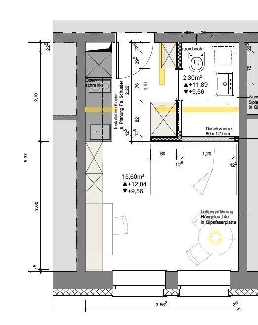 Ein Schreibtisch mit Stuhl, ein runder Esstisch und praktische Einbauschränke runden die Einrichtung perfekt ab. Der neu verlegte Linoleumboden in trendiger Grünoptik verleiht dem Raum einen frischen Charakter und ist zugleich ein nachhaltiges Naturprodukt. Das Badezimmer überzeugt mit moderner Dusche, Spiegelschrank und einem Oberlicht, das für angenehmes Tageslicht sorgt.