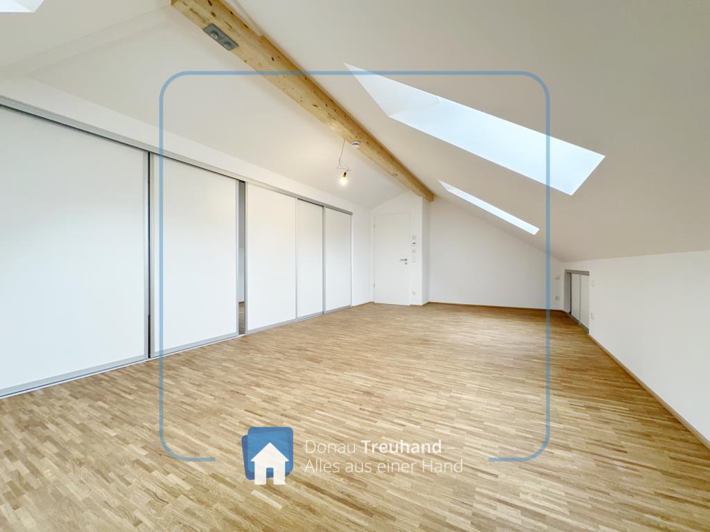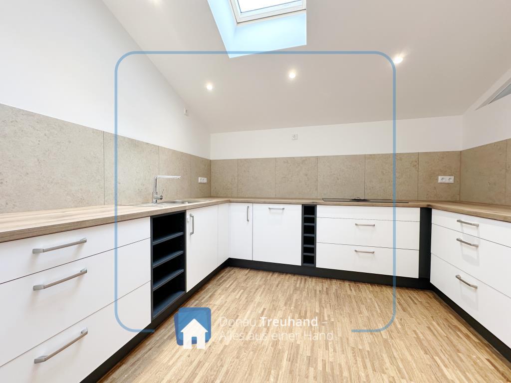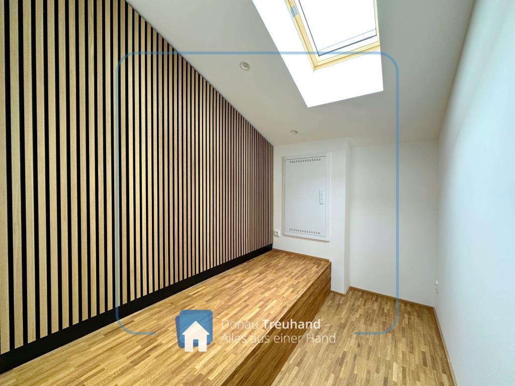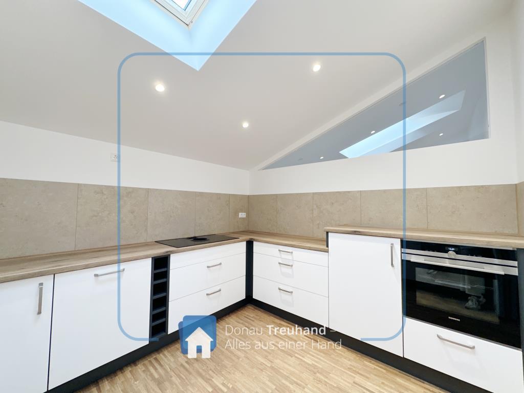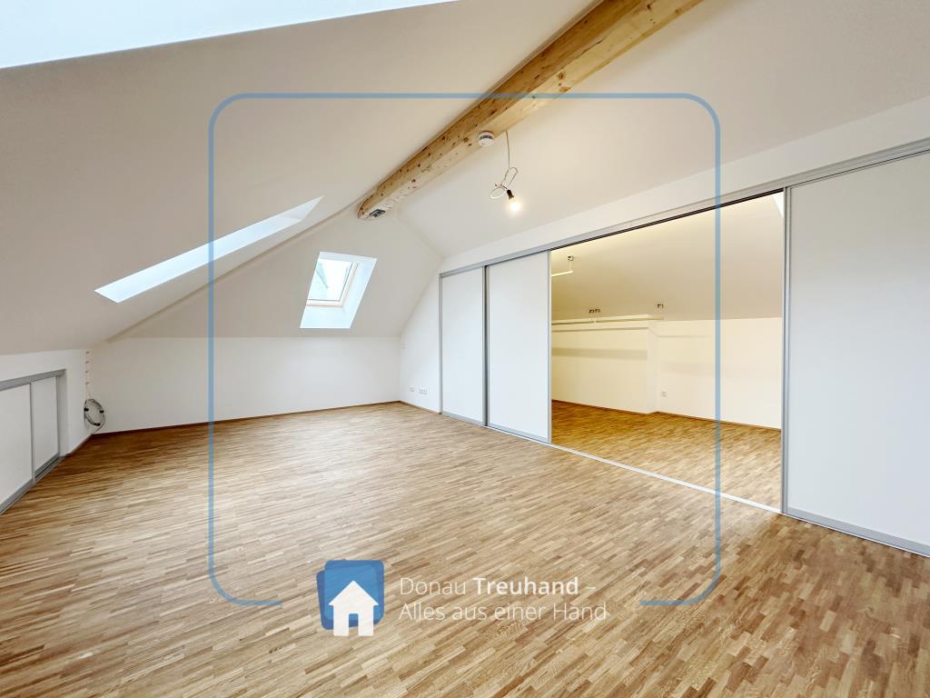 Die neu errichtete Wohnung befindet sich im frisch ausgebauten Dachgeschoss und ist mit hochwertigen Materialien ausgestattet. Der durchgehende Parkettboden sorgt für ein warmes, edles Wohngefühl, während im Eingangsbereich der historische Ziegelboden den Charakter des Hauses stilvoll aufgreift.