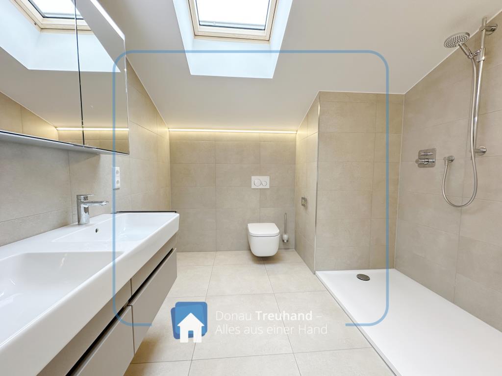 Im Badezimmer mit Waschmaschinenanschluss erwarten Sie ein komfortabler Doppelwaschtisch mit großem Spiegel, hochwertige Steinfliesen sowie eine großzgügige beinah bodengleiche Dusche.