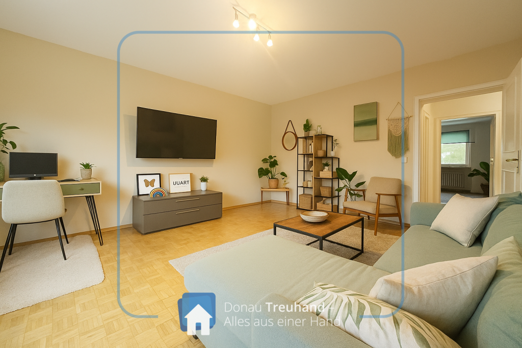 Das Wohnzimmer ist hell und hat direkten Zugang zur Loggia. Zwei weitere Zimmer können flexibel als Schlafzimmer, Kinder- oder Arbeitszimmer genutzt werden. Das Bad ist mit einer Wanne ausgestattet und verfügt über einen Waschmaschinenanschluss.