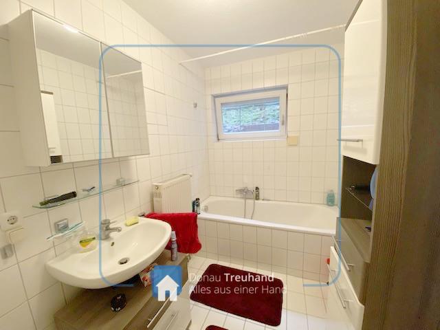 Das Badezimmer ist mit einer Badewanne, sowie einem Waschmaschinenanschluss und einem Fenster ausgestattet.