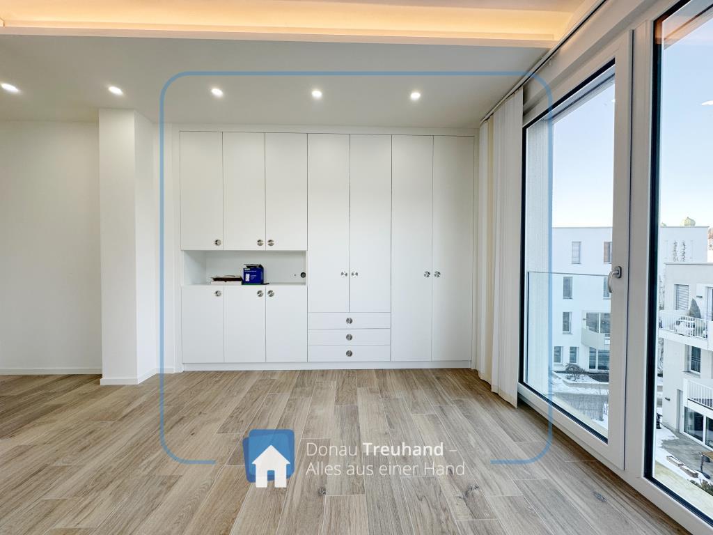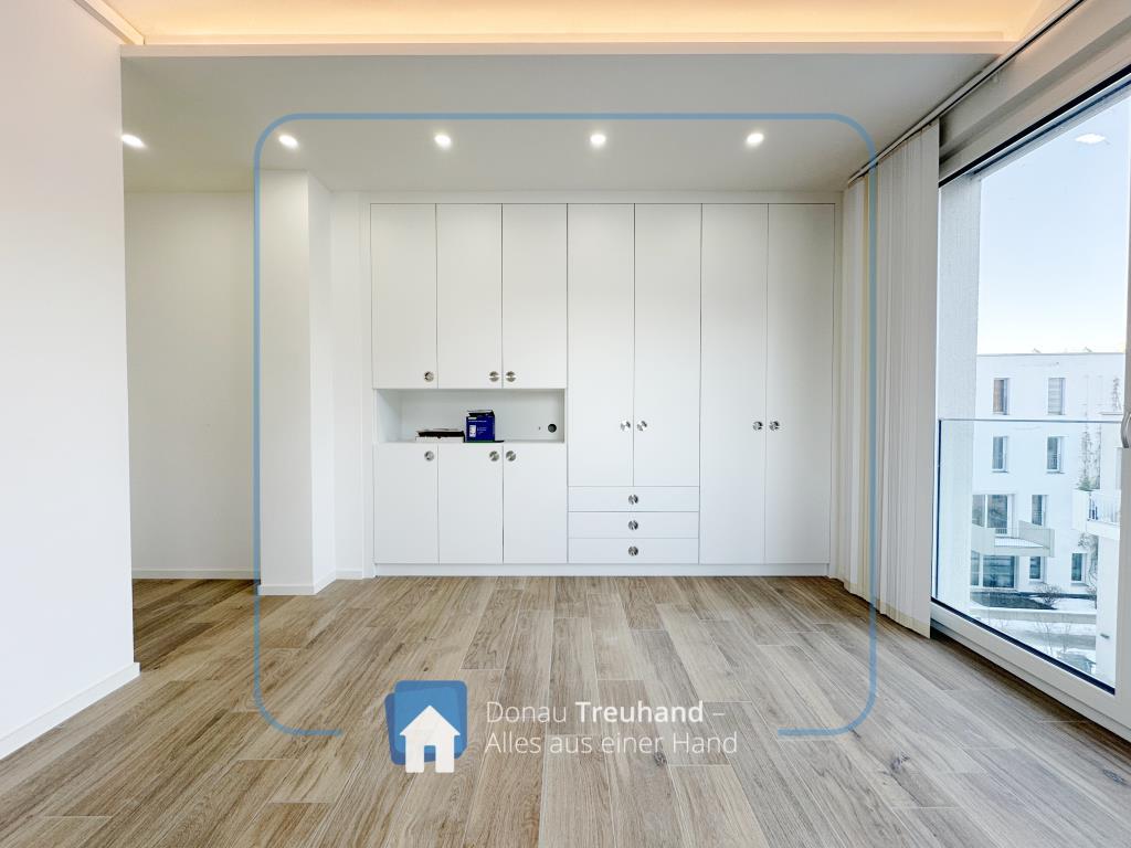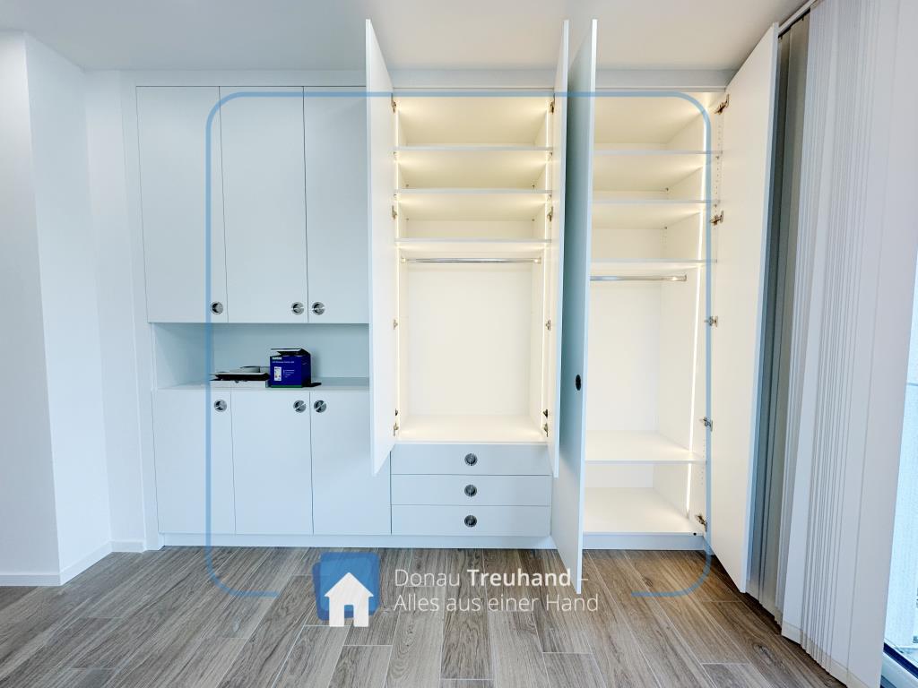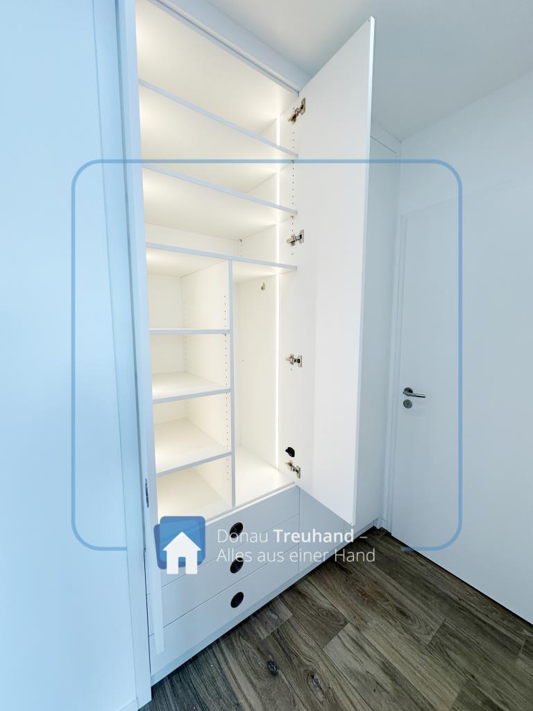 Ein besonderes Highlight sind die maßgefertigten Schreinereinbauschränke mit integrierter Beleuchtung, die nicht nur optisch überzeugen, sondern auch maximalen Stauraum auf höchstem Qualitätsniveau bieten.