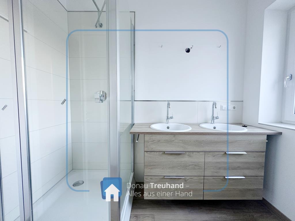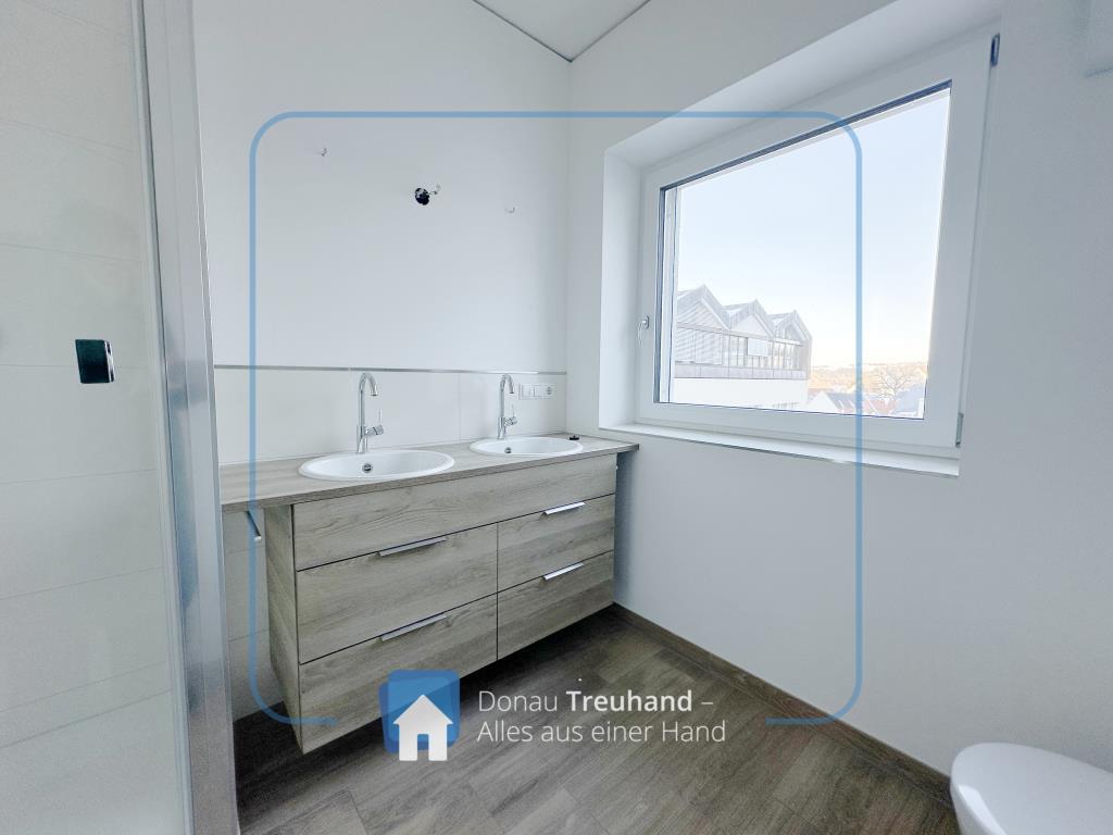Das Bad mit Fenster präsentiert sich hell und modern ausgestattet mit Waschtisch, Doppelwaschbecken sowie einem Waschmaschinenanschluss.