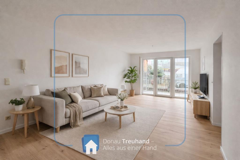 Der großzügige Wohnbereich wirkt durch den neu verlegten Boden modern und wohnlich zugleich und bietet direkten Zugang zum Balkon mit Nordwest-Ausrichtung - perfekt für entspannte Stunden nach der Arbeit.